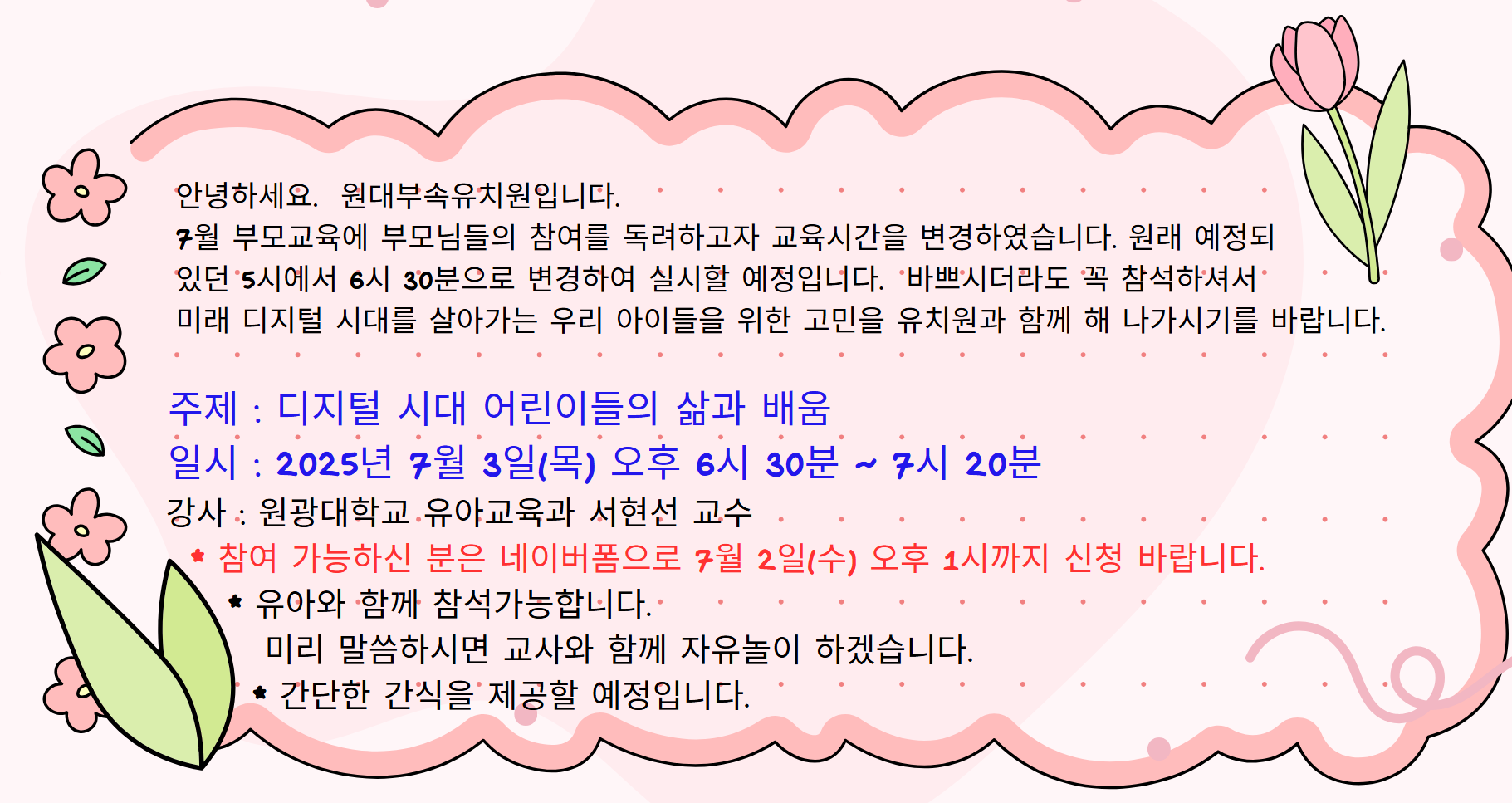 2025³â ºÎ¸ð±³À°À» ÁøÇàÇÒ ¿¹Á¤ÀÔ´Ï´Ù. Âü¿© ½ÅûÀº ³×À̹öÆûÀ¸·Î ½Åû ¹Ù¶ø´Ï´Ù. ÁÖÁ¦: µðÁöÅÐ ½Ã´ë ¾î¸°À̵éÀÇ »î°ú ¹è¿ò ÀϽÃ: 2025³â 7¿ù 3ÀÏ(¸ñ) ¿ÀÈÄ 6½Ã 30ºÐ ~ 7½Ã 20ºÐ °»ç: ¿ø±¤´ëÇб³ À¯¾Æ±³À°°ú ¼Çö¼± ±³¼ö * Âü¿© °¡´ÉÇϽŠºÐÀº ³×À̹öÆû 7¿ù 2ÀÏ(¼ö) ¿ÀÈÄ 1½Ã±îÁö ½Åû * ³×À̹öÆû Âü¼®: https://naver.me/GT6TJPBu